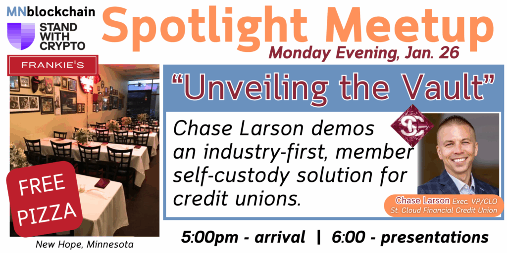 Come be a part Monday evening, January 26 at this month’sSpotlight Meetup brought to us by Frankie’s Chicago Style and Stand With Crypto.