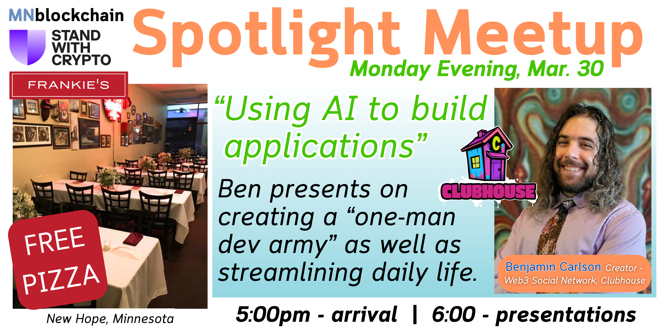 Come be enlightened on some practical uses for A.I. in your life. Be a part Monday evening, March 30 at this month’sSpotlight Meetup brought to us by Frankie’s Chicago Style and Stand With Crypto.